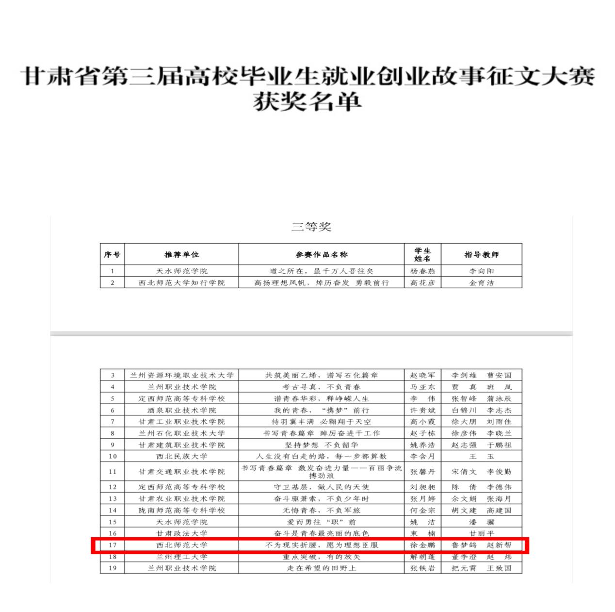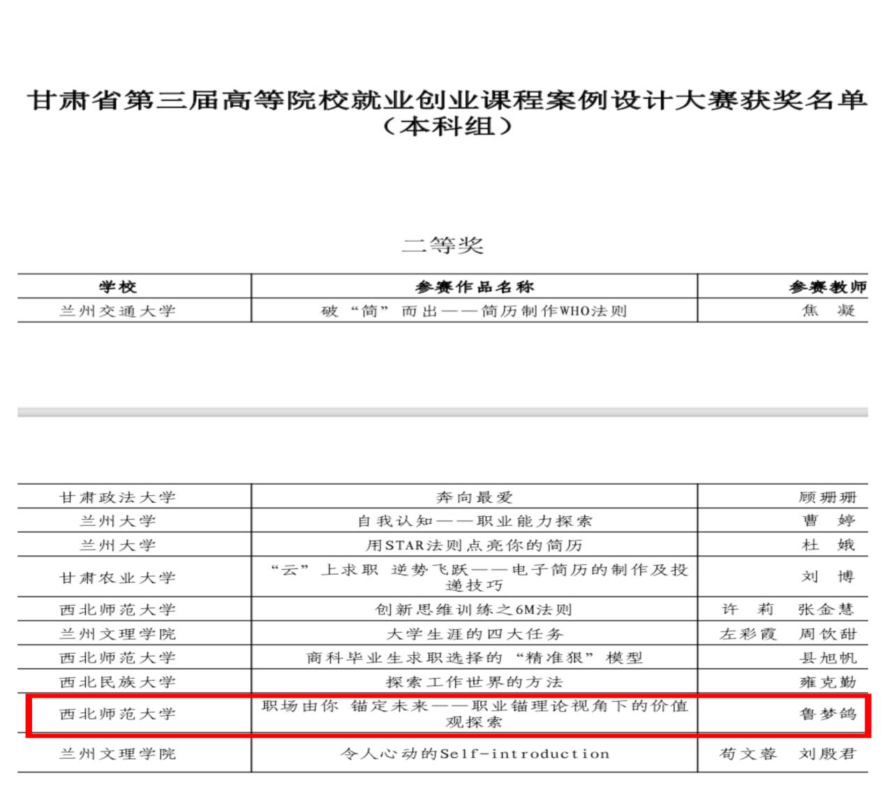 前期经过学院审核复选、学校决赛推荐层层选拔,甘肃省第三届高等院校就业创业课程案例设计大赛中beat365官网专职辅导员老师鲁梦鸽的作品《职场由你 锚定未来—职业锚理论视角下的价值观探索》获本科组二等奖,甘肃省第三届高校毕业生就业创业故事征文大赛中beat365官网18级毕业生徐金鹏同学的作品《不为现实折腰,愿为理想臣服》获三等奖。