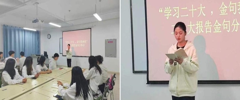 活动开始,主持人秦文梅带领大家共同学习了二十大召开的重大意义,和大家一起读原文、悟原理、知原意,用声音传播理论的光芒,用声音感悟思想的伟力,引导全体同学全面准确、深入理解党的二十大精神,切实把思想和行动统一到党的二十大精神上来,把智慧和力量凝聚到党的二十大部署上来。在场同学倍感振奋,深受鼓舞。