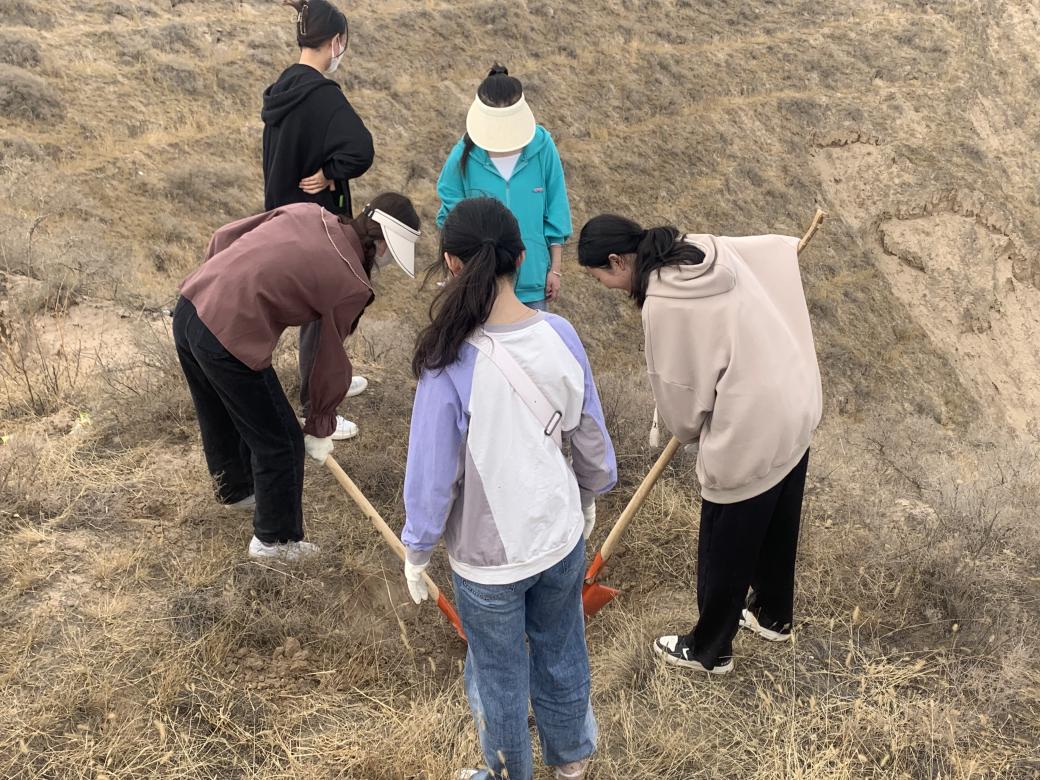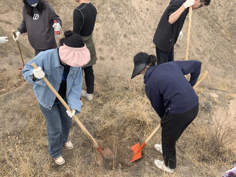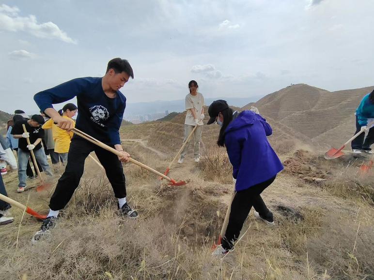 植树现场各位老师和同学们热情高涨、干劲十足。党委书记谢致远亲身加入到学生队伍中,与同学们一起挥锹铲土、合力扶苗、浇水灌溉。教师李东泽、侃卓措以身作则,与同学们一起挥锹挖土、刨坑围堰。
