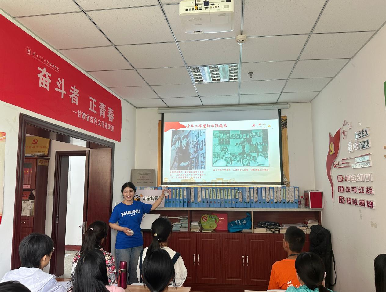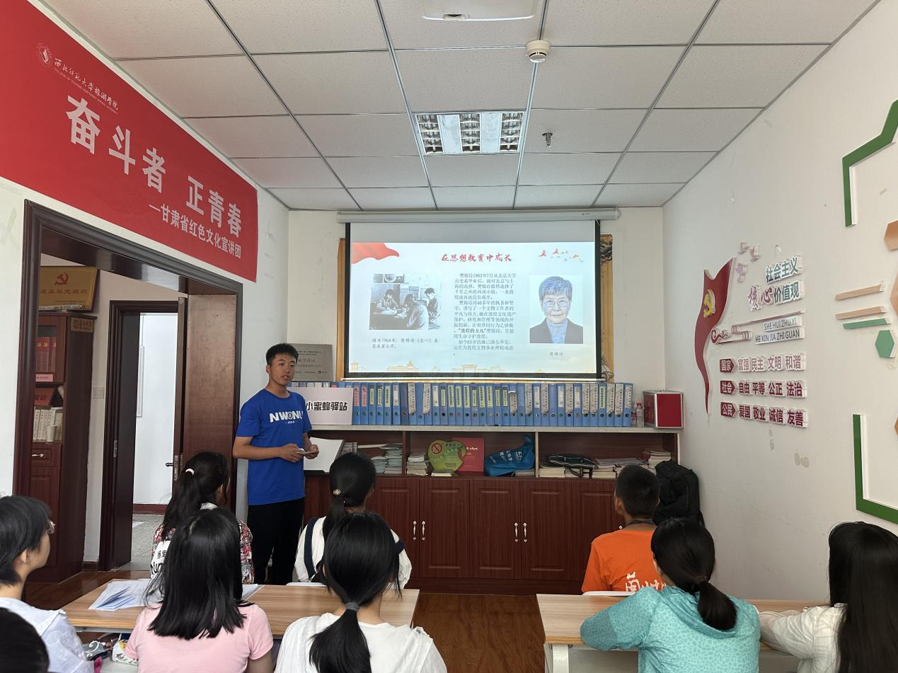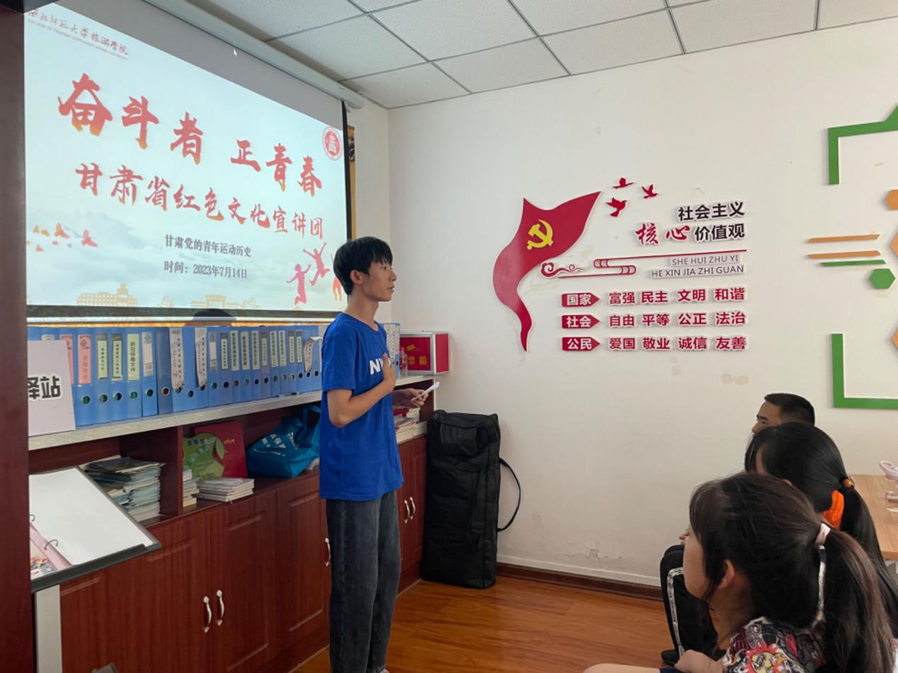 为进一步深入贯彻党的二十大精神,深刻领悟红色文化价值意蕴,提高甘肃省红色文化影响力,推动甘肃省红色文化创新性发展,让红色文化走进青年学生。2023年7月14日,“奋斗者 正青春”甘肃红色文化宣讲实践团走进师大社区向beat365中文官网附属中学的青年学生开展以甘肃党的青年运动历史为主要内容的甘肃省红色文化宣讲活动。让甘肃省红色文化在新征程上焕发时代光芒,让广大青年学生自觉传承革命精神、赓续红色血脉。