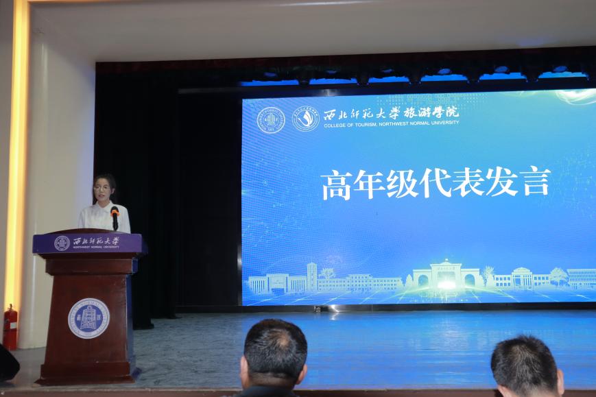2020级旅游管理卓越班王亚琴代表高年级同学发言,热忱真挚地分享了大学三年的心路历程和在创新创业竞赛、志愿服务、社会实践和社团管理等方面的收获与经验,希望同学们在大学里不要随波逐流,做真正的自己;树立良好的时间观念,对自己主动严格要求;不要过于功利,做事重视过程。