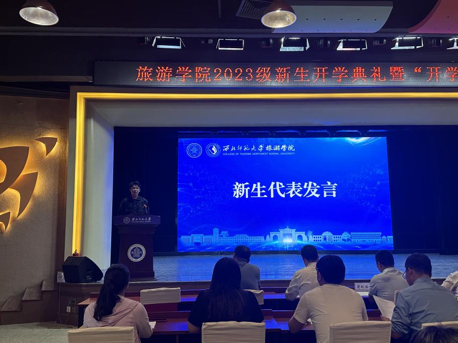 “过道的绿树成荫、教学楼的瓦缝参差、如意湖的波光粼粼……独属于西师的韵味一直氤氲在这所高等学府上空,承载着历史的溯洄与溯游”,2023级旅游管理专业二班孙博熔作为新生代表在发言中表示,在未来将时刻谨记“知术欲圆、行旨须直”的校训,践行“行万里路、读万卷书”的院训,以文促旅、以旅彰文,为文旅事业贡献自己的力量。