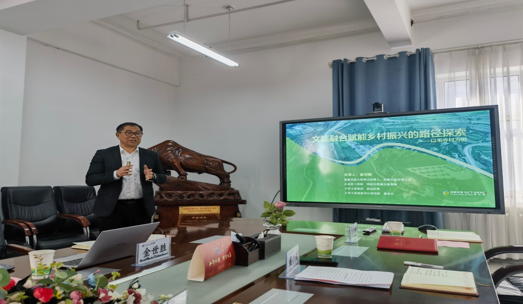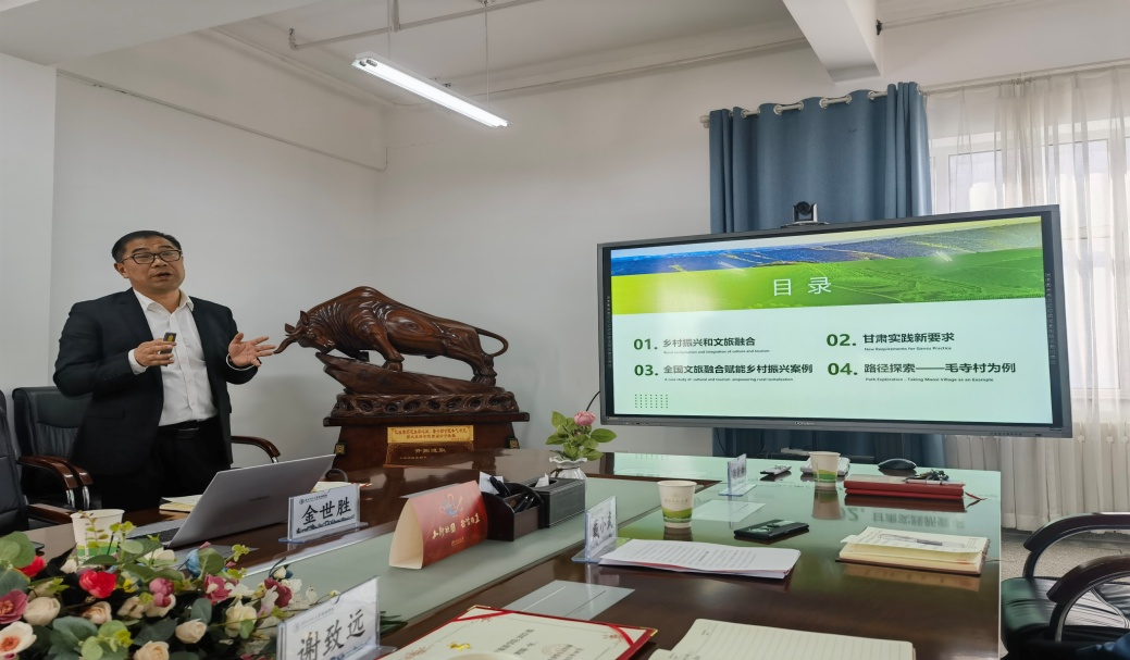 金世胜介绍了自己的学科背景和发展历程,鼓励同学们一定要坚持旅游管理专业的应用型、综合型和时政型的特点,从实践中找到自己的专业兴趣。主要从乡村振兴和文旅融合、甘肃实践新要求、全国文旅融合赋能乡村振兴案例、路径探索——毛寺村为例四个方面进行讲述,并从以农耕文化为魂、以村落宅院为形的发展理念,以美学、文学、哲学的视角探索毛寺村的发展路径。
