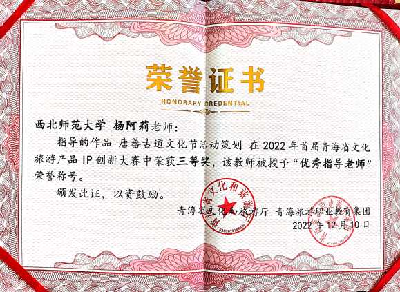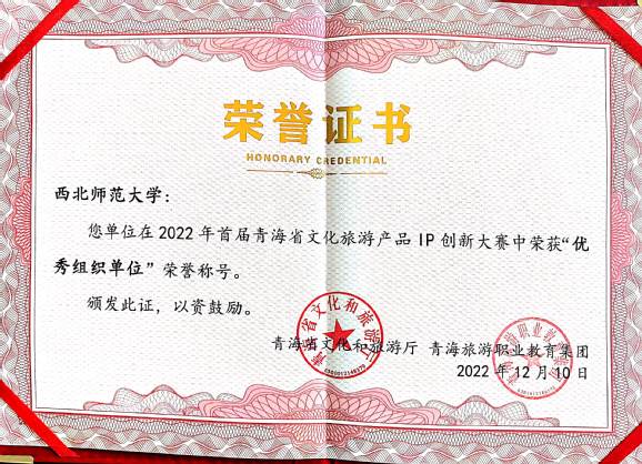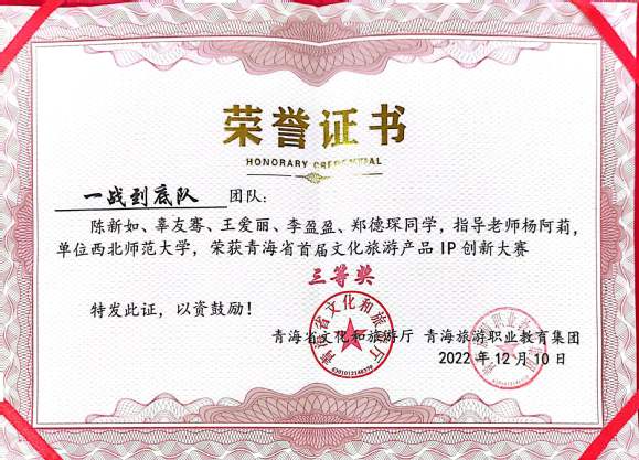 在激烈的角逐后,beat365中文官网参赛团队脱颖而出,荣获“优秀组织单位”奖,beat365中文官网教师杨阿莉教授荣获“优秀指导教师”荣誉称号,她所带领的硕士研究生陈新如等同学组成的“一战到底”团队,凭借丰富的活动设计与独特的创意,获得“青海省首届文化旅游产品IP创新大赛三等奖”。