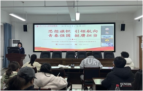 兰州大学信息科学与工程学院学生会主席团成员周忠泉,从深入学习贯彻习近平新时代中国特色社会主义思想、充分发挥团员带动、青年党建带动团建的优势、紧密结合党的工作要求、全面提升团组织的凝聚力战斗力及紧密结合国家重大战略、积极引导广大青年融入中国式现代化建设的洪流中四个方面并结合本学院工作进行分享。表示学生干部要以德为先、明大德、守公德、严私德,更要善于知行合一、迈稳步子、夯实根基,久久为功。
