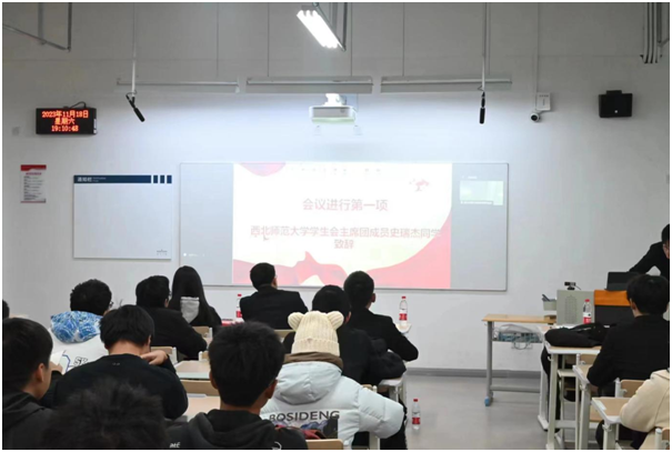 会议第二项,由兰州大学学生会主席团成员王水超同学发言,他表示我们应当充分贯彻二十大精神,团员青年该走在前、做榜样、基层学生组织工作是难点及困点,所以要创新组织模式、提高组织效率、推进改革、找出破题之策,提出新思路新形式新方法。全心全意服务同学,总结经验。