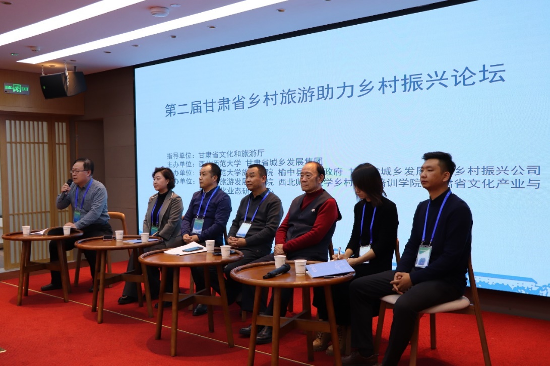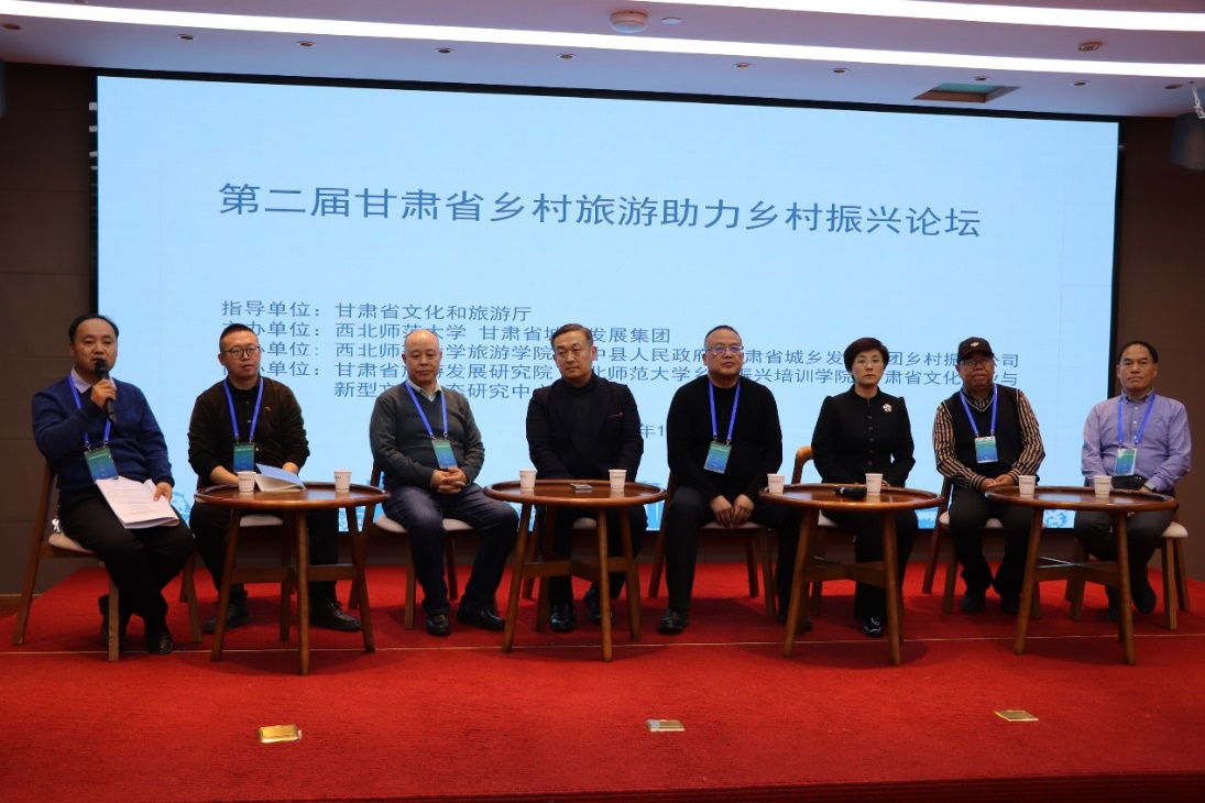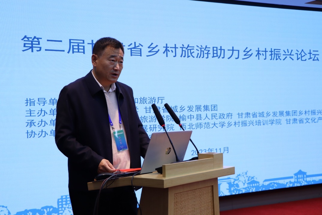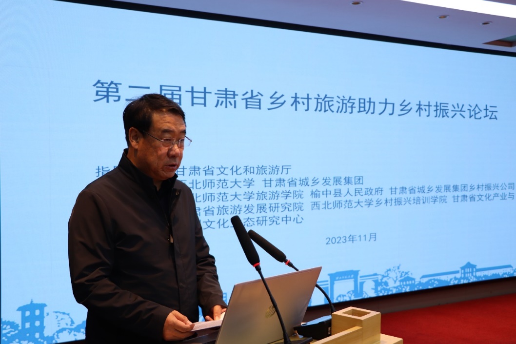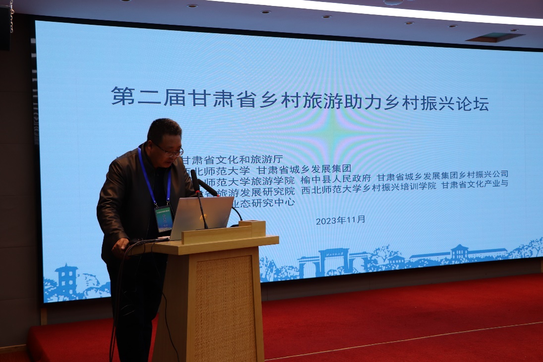 20231124日,“第二届甘肃省乡村旅游助力乡村振兴论坛”在甘肃省兰州市榆中县栖云小镇召开。本次论坛甘肃省文化和旅游厅指导,西北师范大甘肃省城乡发展集团联合主办,beat365中文官网、榆中县人民政府、甘肃省城乡发展集团乡村振兴公司联合承办,甘肃省旅游发展研究院、beat365中文官网乡村振兴培训学院、甘肃省文化产业与新型文化业态研究中心联合协办。论坛以“文旅赋能创新引领乡村振兴”为主题,探讨如何深化文旅赋能乡村振兴,推动乡村旅游发展模式创新、产品升级、服务优化,助力甘肃省乡村振兴事业发展。论坛采用线下方式进行,来自甘肃省文化和旅游厅、榆中县人民政府、beat365中文官网的领导、文化旅游行业代表及beat365中文官网师生100余人参与了主旨演讲和圆桌论坛对话。