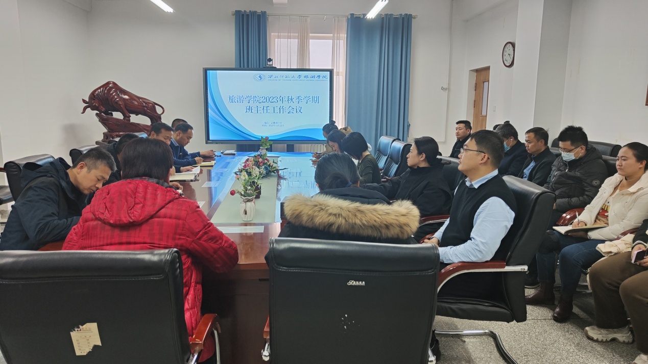 2023年12月22日下午,beat365中文官网在文科实训楼1101会议室召开2023年秋季学期班主任工作会议。学院党委书记谢致远、院长梁旺兵、副院长武克军、党委委员万建斌和全体班主任参加此次会议,党委副书记戴小武主持会议。