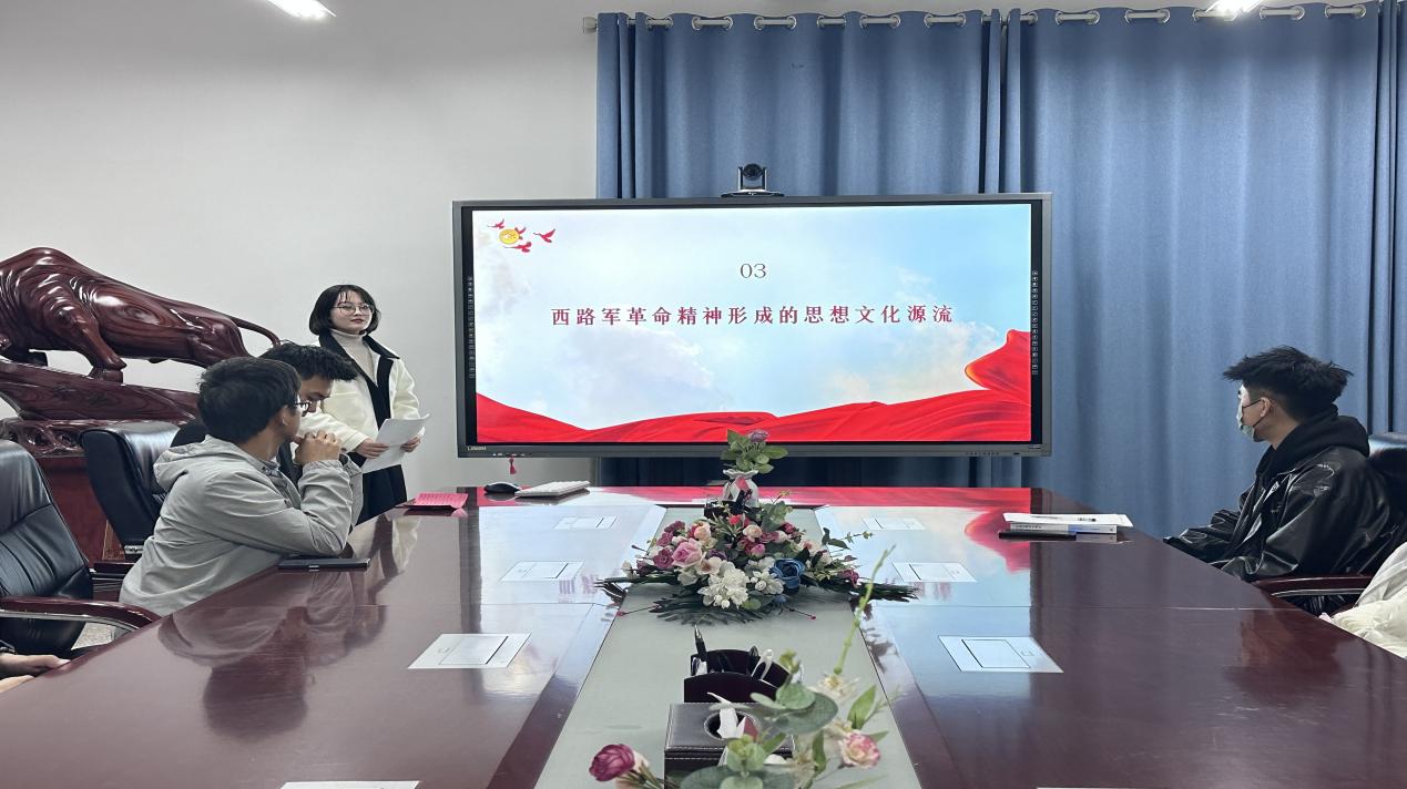 随后,续锦雨同学带领大家探索了西路军革命精神形成的思想文化源流。在她生动大方的讲述中,帮助同学们进一步加深了解作为前进火炬的中华民族穿过漫漫历史长河,不断丰富,在民族灾难中振作,在至暗时刻发力的强大韧性。同时,借助视频资料向大家展示了古浪战役的背景和如今古浪战役纪念馆的发展,说明西路军革命精神在甘肃地区的传承。