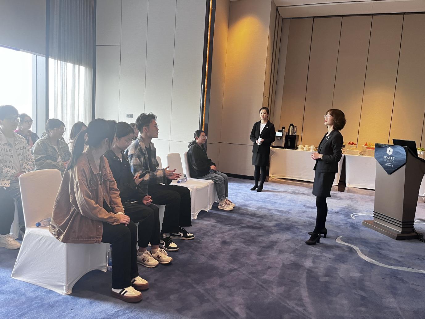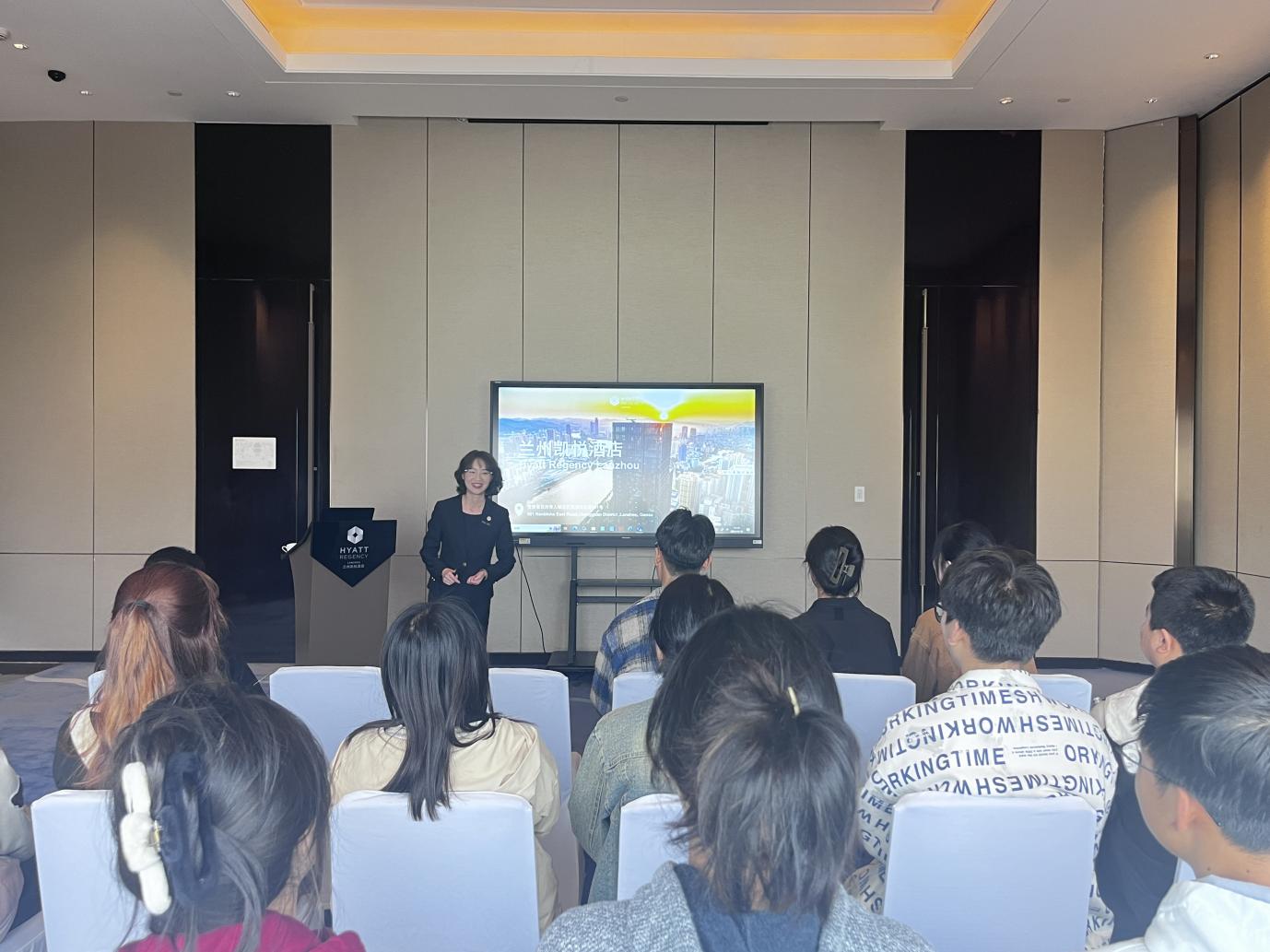 兰州凯悦酒店培训经理张小惠、招聘主任王思缘从专业就业前景、酒店就业形势、未来发展方向和凯悦酒店基本情况等个方面为同学们进行详细介绍,她表示非常欢迎同学们到凯悦酒店实习或工作。张小惠通过分享自身酒店求职经历,帮助同学们进一步了解酒店行业的行业现状和发展前景。