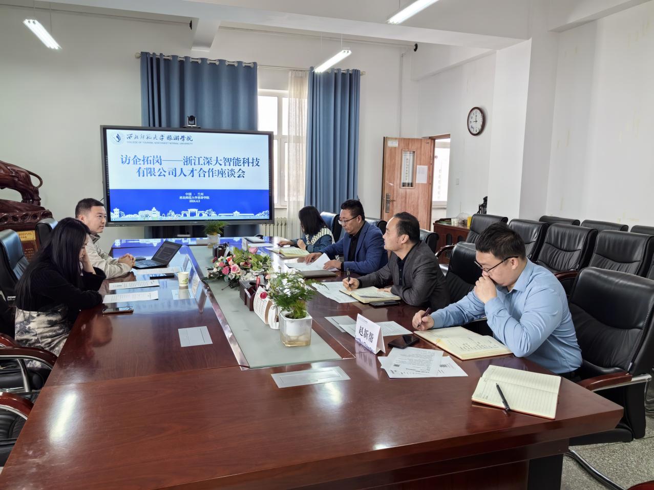 4月3日上午,浙江深大智能科技有限公司西北大区总经理朱灵通、产品运营经理张诗悦一行到beat365中文官网就校企合作、人才招聘等事宜交流座谈。院长梁旺兵、副院长武克军、党委副书记戴小武、办公室主任安翠香、团委书记鲁梦鸽、辅导员赵新帮参加。