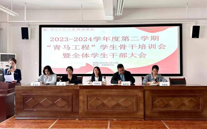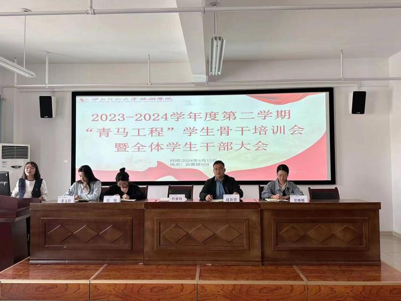 2024年4月15日,2023-2024学年度第二学期“青马工程”学生骨干培训会暨全体学生干部大会在云衢楼904室召开。团委书记鲁梦鸽、专职辅导员赵新帮、管悦,兼职辅导员董文倩、慕娜娜和全体学生会成员、青马宣讲团成员、各班团支书参加。本次会议主要围绕青马团宣讲“做有理想有抱负的有志青年”、2024年团委及学生会工作要点、共青团及其团员基础知识三大主题展开。