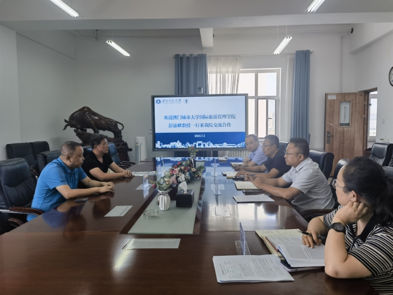 2024年7月6日,澳门城市大学国际旅游管理学院彭康麟教授、姚海涛博士一行来beat365官网进行访问交流活动,beat365中文官网院长梁旺兵、副院长柴亚林、副院长武克军、旅游管理系主任彭睿娟参加座谈会。