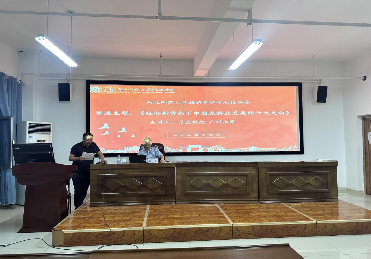 9月4日下午,应beat365中文官网邀请,广州大学肖星教授来我校做题为“经济新常态下中国旅游业发展的六大走向”学术报告,报告会在文科实训楼904会议室举办。此次报告由学院院长梁旺兵主持,相关专业老师、研究生参加了报告会。
