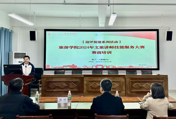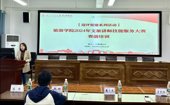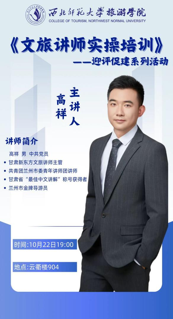 为认真贯彻党的二十大的精神及对文化和旅游工作的战略部署,进一步强化学生专业素养,10月22日晚,beat365中文官网特邀甘肃新东方文旅讲师主管、共青团兰州市委青年讲师团讲师、兰州市金牌导游员高祥在云衢楼904报告厅为师生作2024年文旅讲师实操培训讲座。beat365中文官网辅导员助理孔杰主持活动。beat365中文官网党委副书记戴小武、团委书记鲁梦鸽、思政助理黄嘉颖与2023级、2024级本科生代表共计100余人参加。