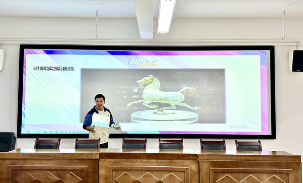 高翔老师以铜奔马等进行示范讲解实操演练,引导参赛同学们以“总-分-总”的结构进行讲解词创作,并鼓励同学们在日常练习中尝试无实物表演文化讲解,用“熟练”克服紧张,注重“情感尺寸、力度把握”。