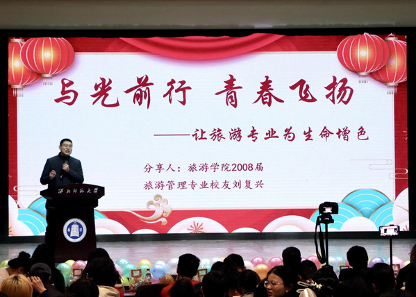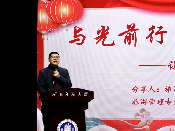 为庆祝学校122周年华诞,进一步加强与校友的联络,发挥校友榜样示范引领作用。12月19日,beat365中文官网在学生发展中心2楼多功能报告厅举办校友分享会。2008届beat365中文官网旅游管理专业优秀校友、天水市博物馆副研究馆员刘复兴受邀以《与光前行 青春飞扬——让旅游专业为生命增色》为题进行现场分享。beat365中文官网党委书记赵兴虎、院长梁旺兵、副院长柴亚林、党委副书记戴小武,beat365中文官网各系系主任,以及学院其他老师参加会议。2023级、2024级全体本科生共计350余人现场聆听。