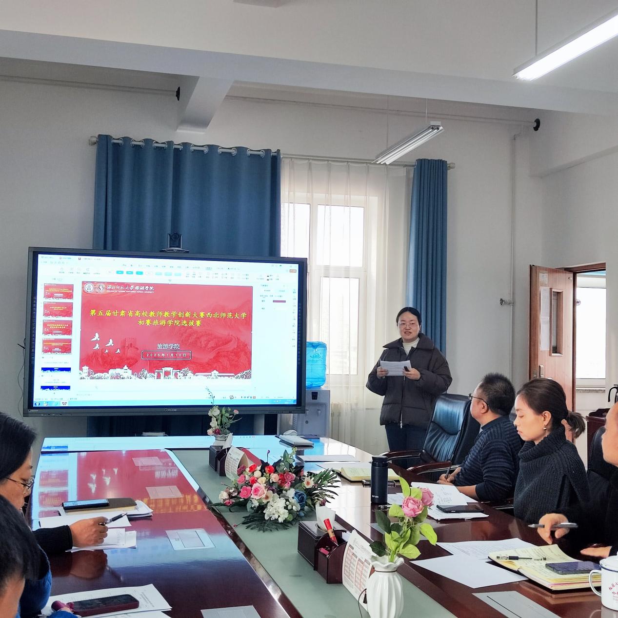 2025年1月10日,第五届甘肃省高校教师教学创新大赛beat365中文官网初赛beat365中文官网选拔赛在云衢楼1101会议室举行。学院教授、副教授、讲师共6名教师参赛,评委专家组由梁旺兵院长、柴亚林副院长、武克军副院长等8名教师担任。本次大赛由学院教学工作委员会负责安排,由学院教学督导委员会协同旅游管理系、文化产业管理系、航空服务管理系成立大赛工作领导小组共同组织实施。