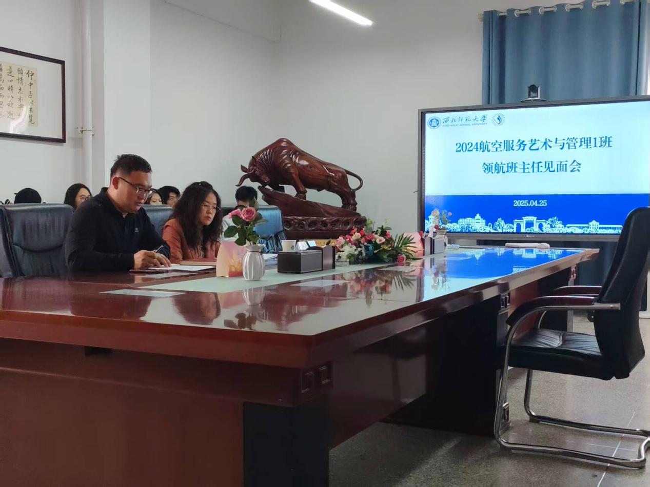 2025年4月25日下午,2024级航空服务艺术与管理一班召开领航班主任见面会,校纪委副书记王小燕老师莅临会议并讲授主题教育专题党课,护航班主任与42名班级学生共同参加。