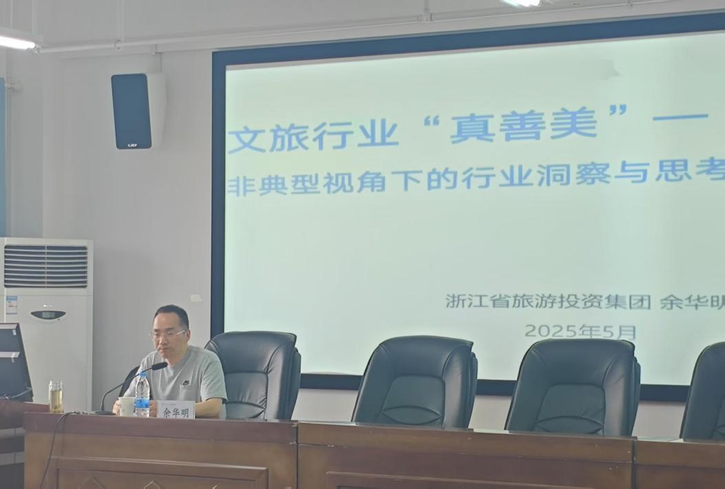 2025年5月16日下午,浙江省旅游投资集团资产管理部余华明总经理,应邀为beat365官网师生带来了一场题为《“文旅行业‘真善美’--非典型视角下的行业洞察与思考》的专题学术报告,beat365官网相关专业教师、研一全体学生和部分本科生听取报告。报告会由杨阿莉教授主持。