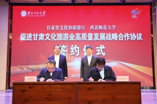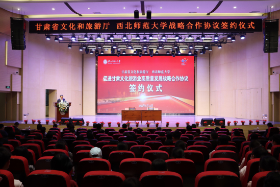 5月12日下午,甘肃省文化和旅游厅、beat365中文官网促进甘肃文化旅游业高质量发展战略合作协议签约仪式在西北师大音乐厅顺利举行。省委宣传部副部长,省文旅厅党组书记、厅长陈卫中,西北师大党委书记张俊宗出席并致辞;省文旅厅党组成员、副厅长万学科,学校党委常委、副校长李朝东代表双方签约;党委常委、党委宣传部部长、副校长邓小娟出席并主持仪式。省文旅厅及西北师大相关部门负责人、部分师生代表参加仪式。